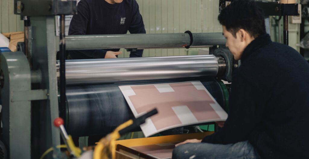 あ、確かにこういう柄って、お菓子の包装紙やパッケージや本の表紙でよく見るなあ〜とは思いつつ、それがどうやって作られているかは今まで考えたことがなかったです。ロールエンボス機に紙を通す→受け取る→積むという一連の流れを、2人の紙職人が息を合わせて作業する姿を見て以来、お菓子の包装紙などを見るとその光景が頭に浮かぶようになりました(笑)