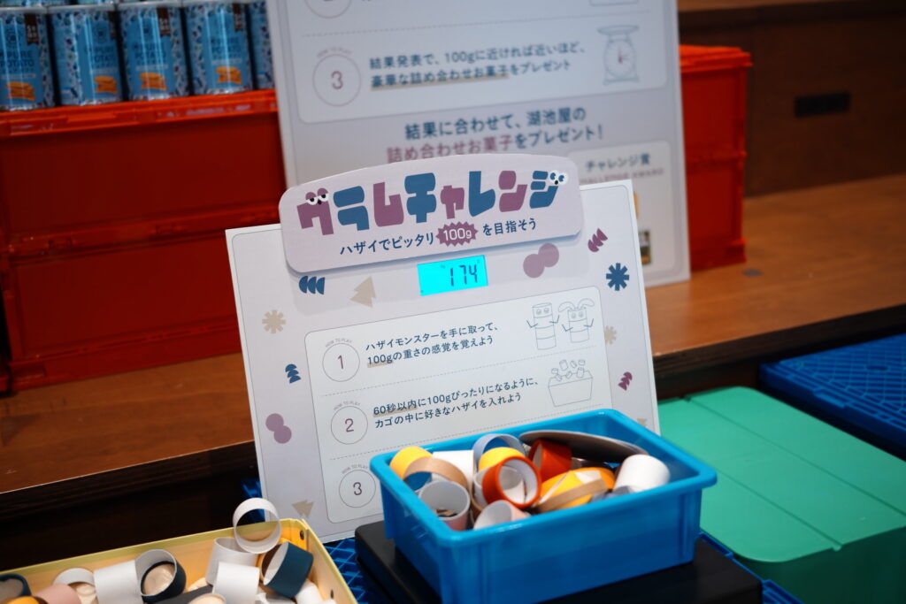 特別コーナーでは、紙の端材をカゴに入れ、重さの感覚だけを頼りにピッタリ100gを目指す「グラムチャレンジ」が行われていました。上の写真は、私が挑戦したときのものです。そうです、ご覧の通り大幅にオーバーしております。普段から紙を扱う会社の社員としてなんとも恥ずべき結果、、、気を取り直してリベンジしたところ102gまで近付けることができました!ちゃっかり、湖池屋さんのお菓子をゲットしました。