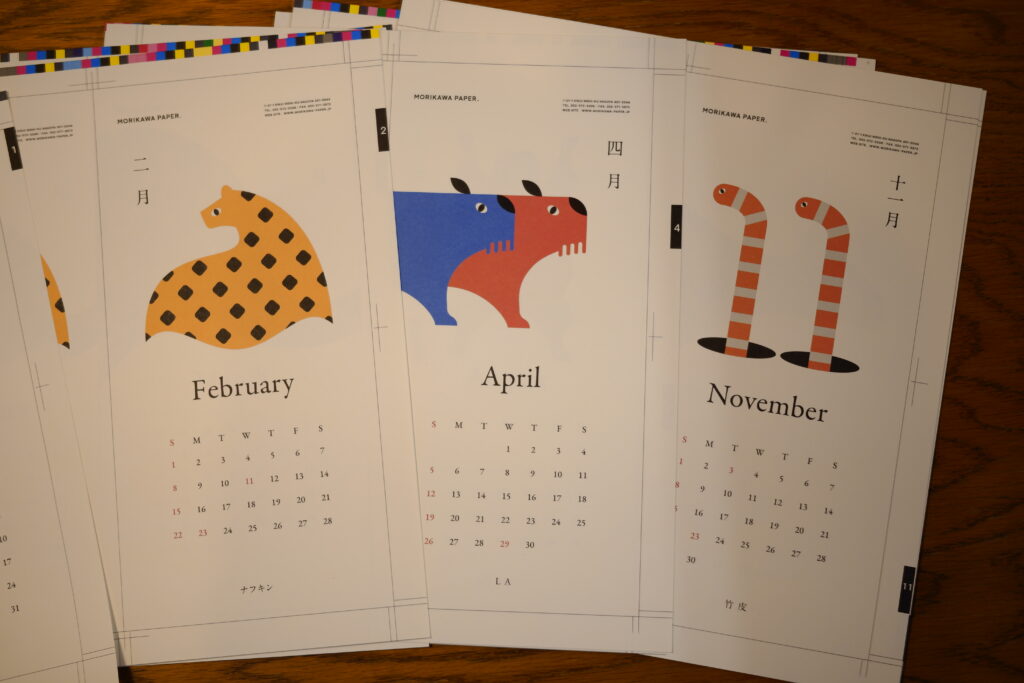 2月はナフキン、4月はLA、11月は竹皮といったように、月ごとに異なるロールエンボス加工が施され、毎月めくるたびに違う表情の紙が現れる仕様になっています。同じ紙でも、加工の違いでこれほどまで質感が変わるのかと、手触りで実感していただけるはずです。