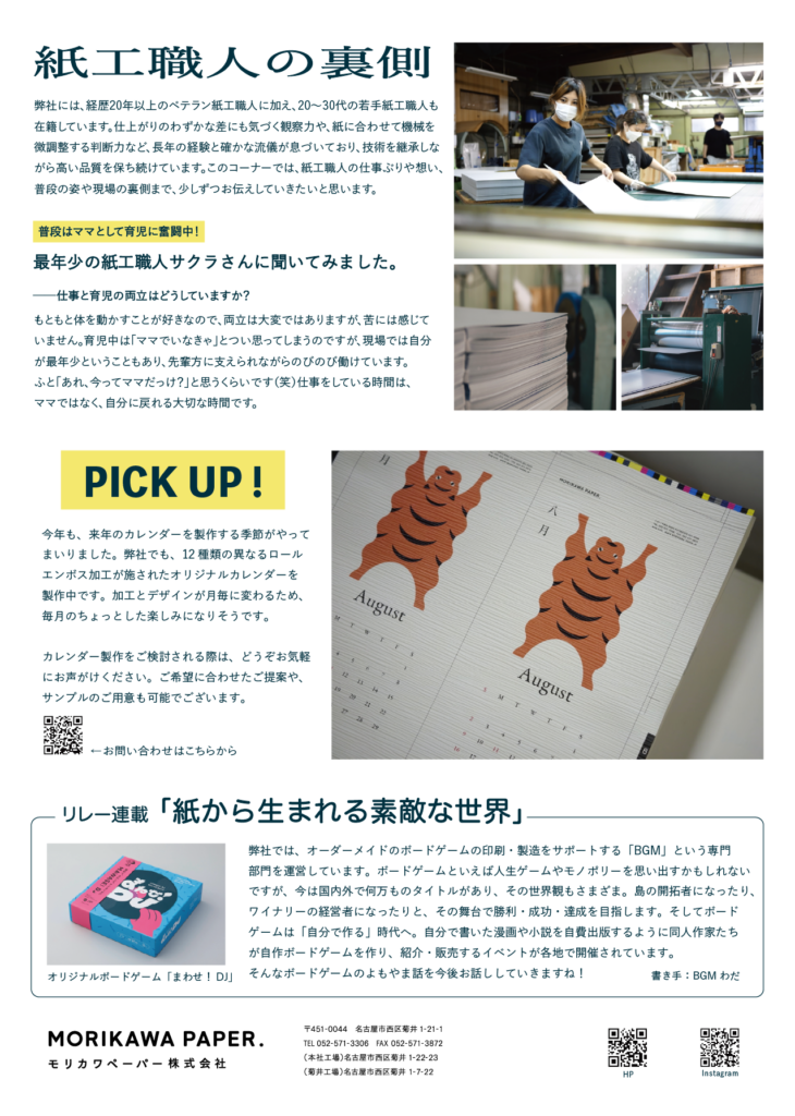またごきげんペーパーでは、手仕事の裏側を紹介するコーナーも設けました。現場の紙工職人に早速インタビューをしたのですが、思いの外、このインタビューの時間がとても有意義だったのです。仕事と育児の両立や、作業中のこだわり、仕事への想いなど日々の会話だけでは知り得なかった話を聞くことができ、その場で一緒に聞いていた社長と専務も嬉しそうでした笑