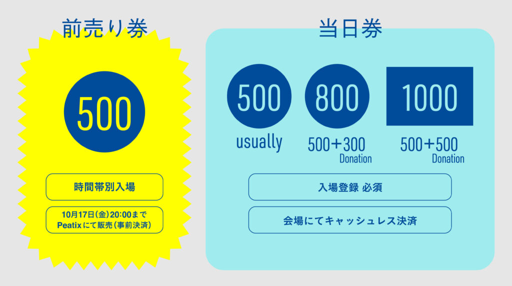 2当日券:通常の入場料 500 円/寄付金込みのオウエン入場料 800 円、1000 円